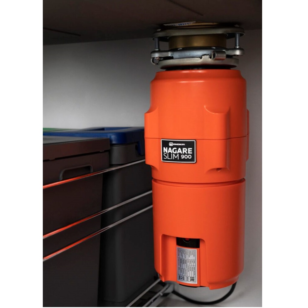 Измельчитель пищевых отходов Omoikiri Nagare Slim 900 оснащет магнитным мотором, мощность 0,75 л.с., скорость вращения диска 3000 об/.мин., потребляемая мощность 550 ВТ/час. В комплекте с измельчителем идет пневматическая кнопка в цвете нержавеющая сталь, брызгозагородитель, крышка-толкатель,сливное колено.