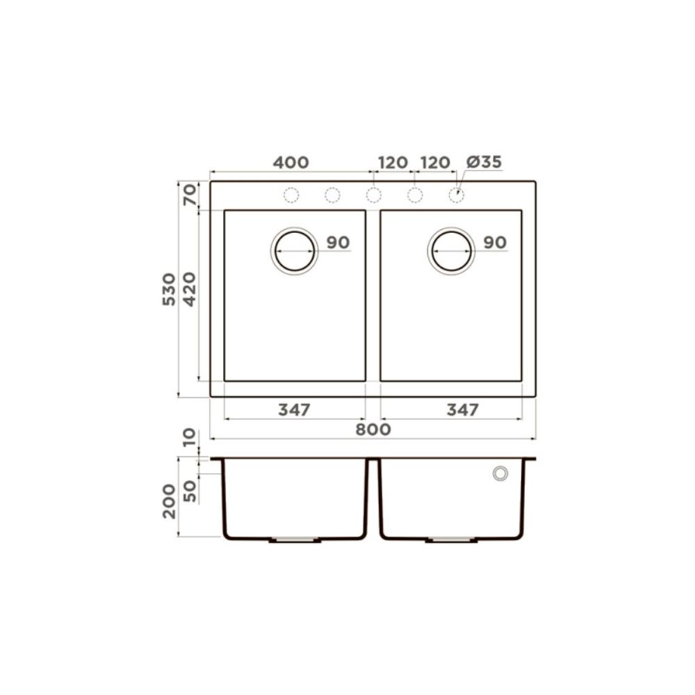 Мойка кухонная Omoikiri из коллекции Bosen 80-2-WH имеет размеры 800х530 мм., изготовлена из искусственного гранита. Форма — прямоугольная, две чаши без отверстия для смесителя. Сифон в комплекте. Ширина чаши 34,7. Врезной монтаж.