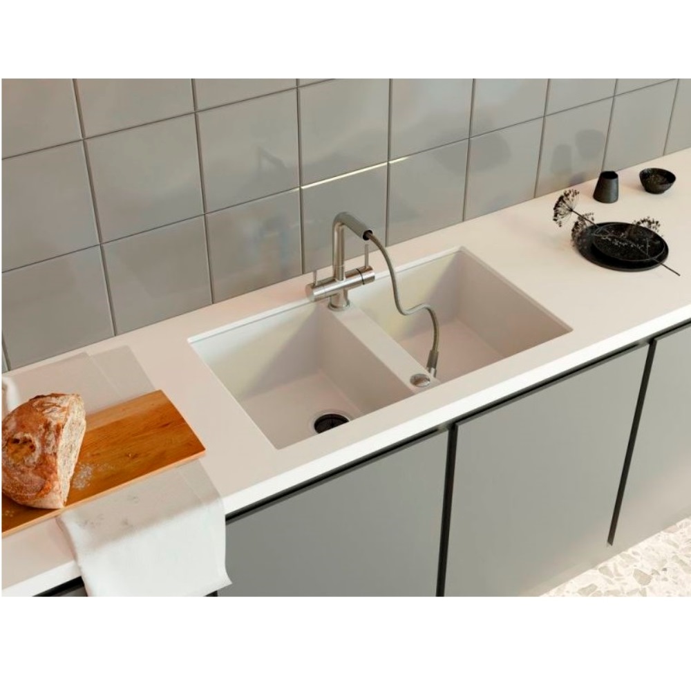 Мойка кухонная Omoikiri из коллекции Kitagawa 83-2-U-WH имеет размеры 836х488 мм., изготовлена из искусственной керамики. Форма — прямоугольная, две чаши без отверстия для смесителя. Сифон в комплекте. Ширина чаши 36,5. Врезной монтаж.