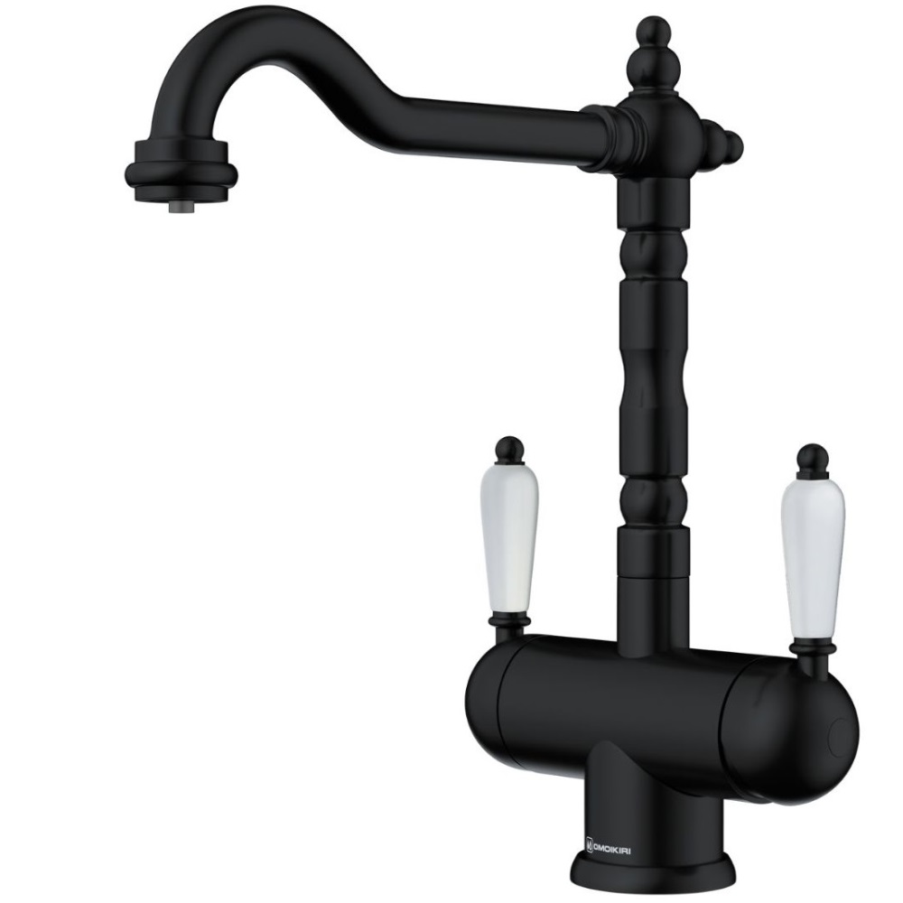 Смеситель для кухни Omoikiri Amagasaki с подключением фильтра оснащен рычажным управлением для регулировки температуры и напора воды. Горизонтальный монтаж на 1 отверстие. Поворотный излив 215 мм.