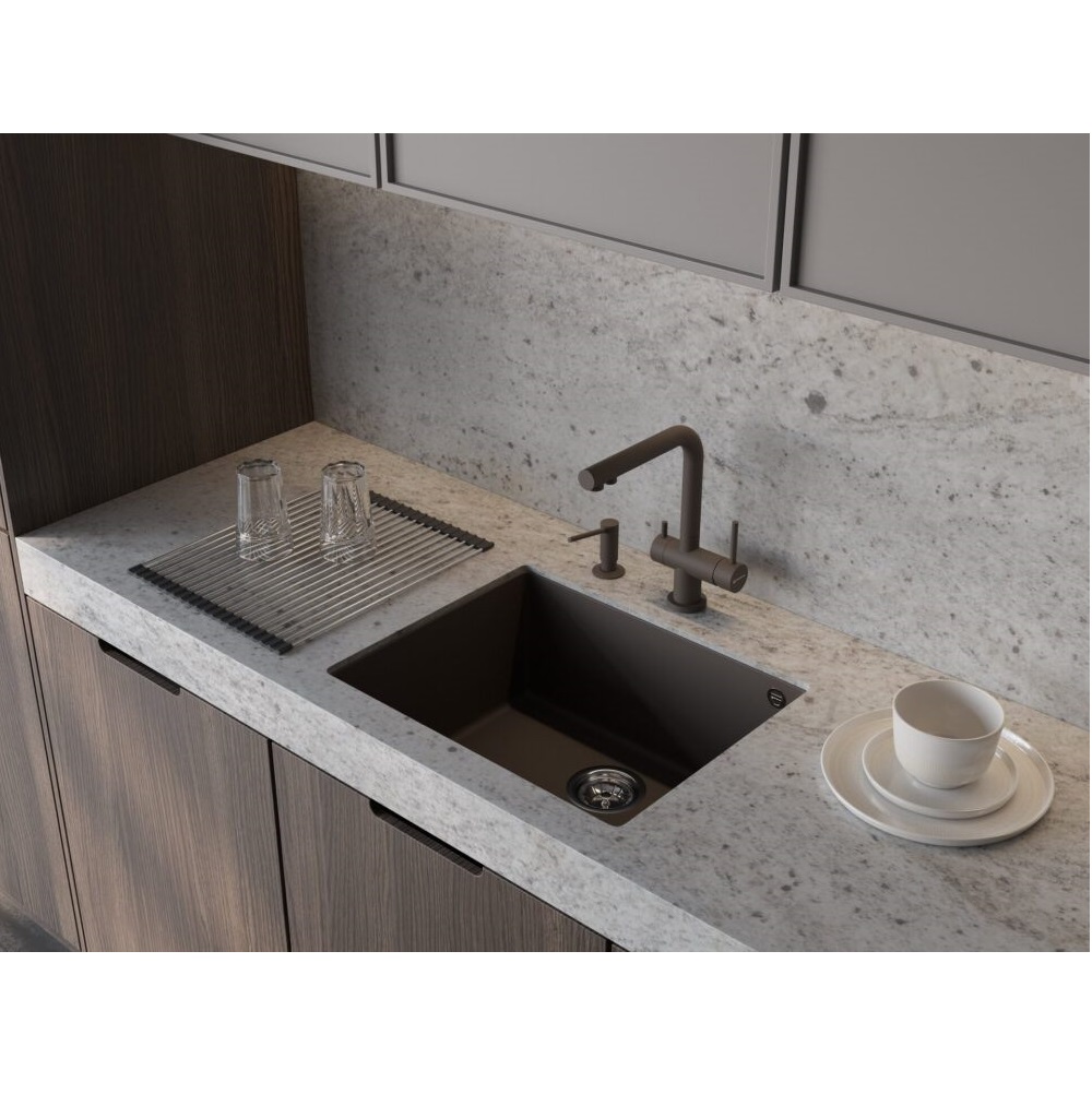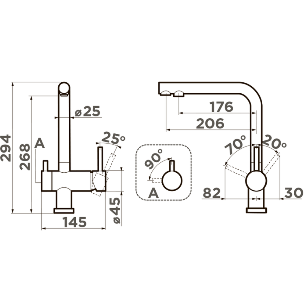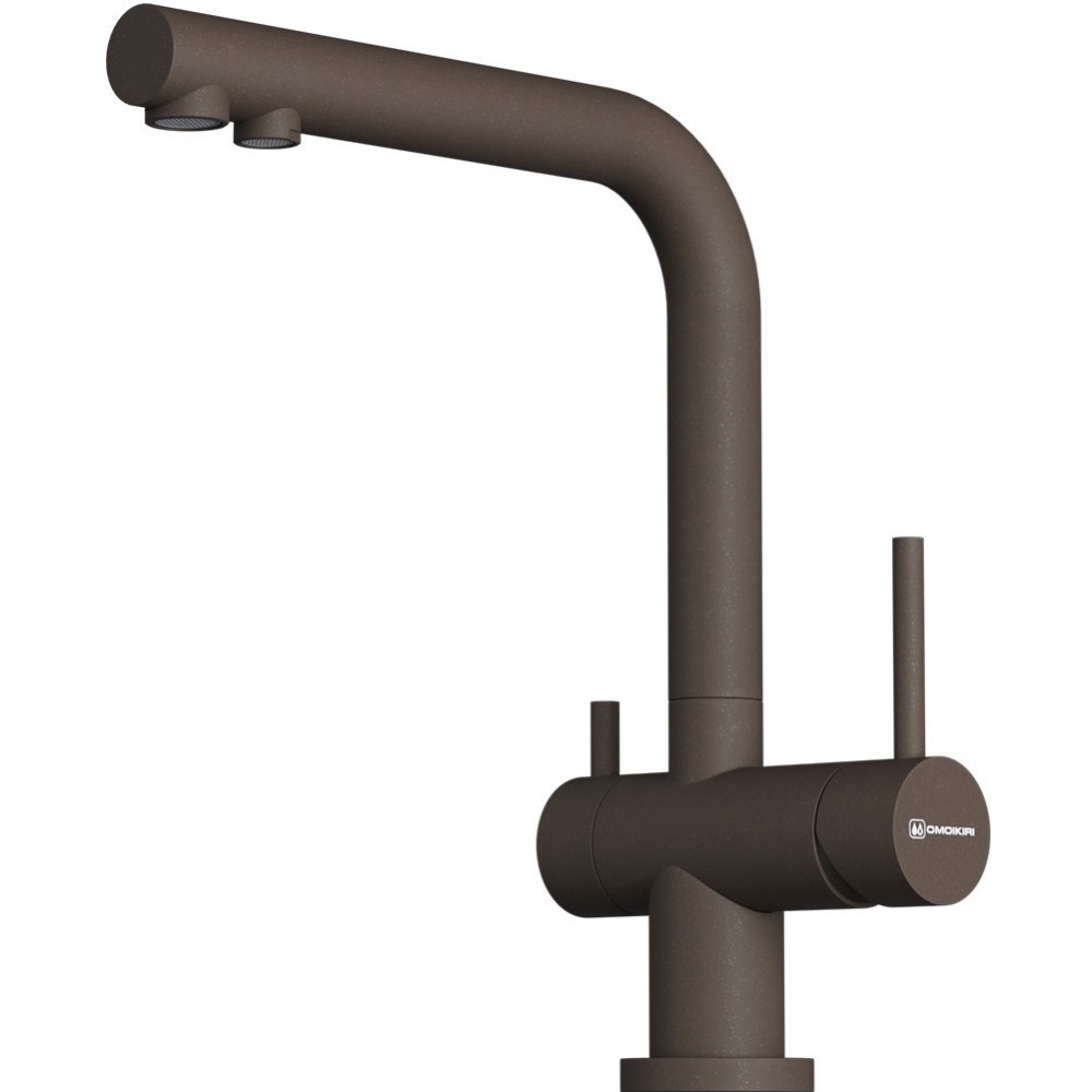 Смеситель для кухни Omoikiri Nagano с подключением фильтра оснащен рычажным управлением для регулировки температуры и напора воды. Горизонтальный монтаж на 1 отверстие. Поворотный излив 176 мм.