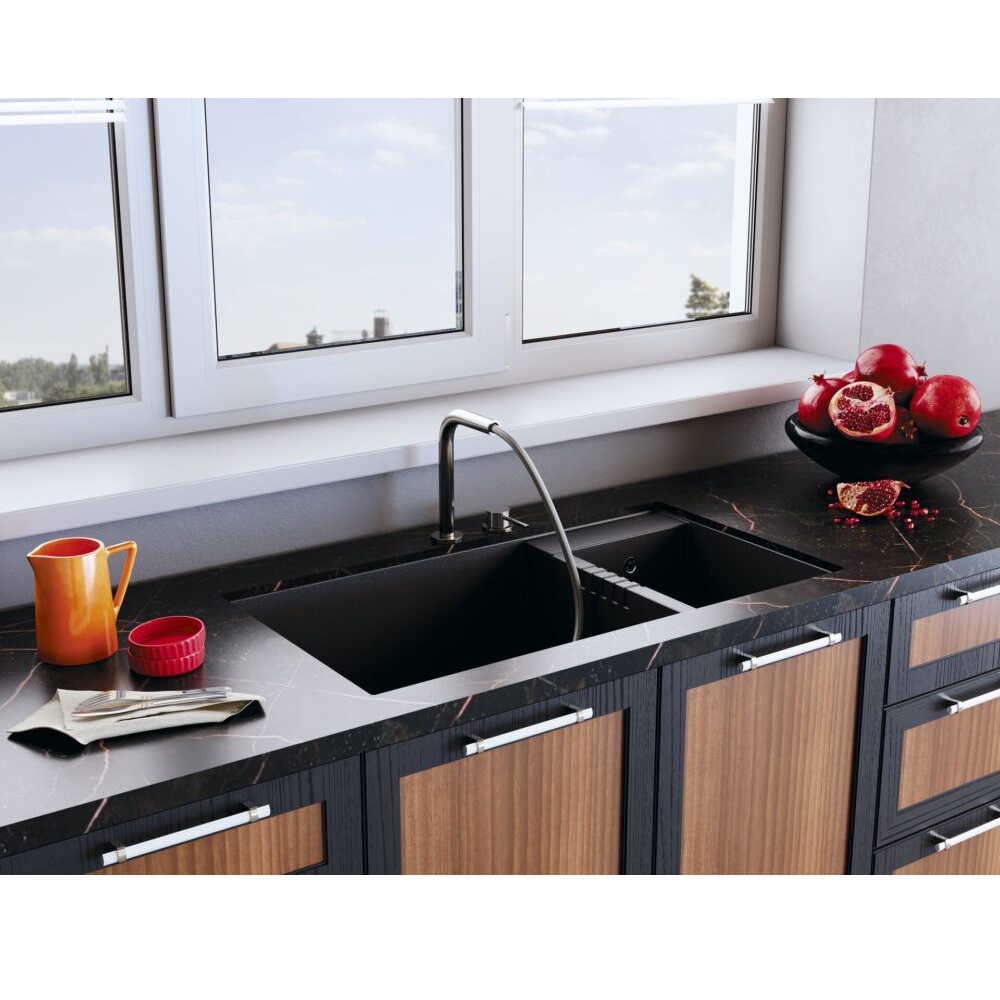 Смеситель для кухни Omoikiri Nara-S оснащен рычажным управлением для регулировки температуры и напора воды. Горизонтальный монтаж на 2 отверстия. Вытяжной излив 220 мм.